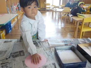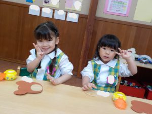 製作も少しずつ始まり今日はのりを使いました。のりの使い方でお話したありさんぐらいの大きさののりを使うなど、お約束をしっかり守ることができました。みんな上手に製作を進められ楽しそうでした♪