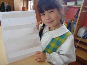 年長さんになると作品の名札を自分で書き貼るため、横向きで苗字から書いてみました!