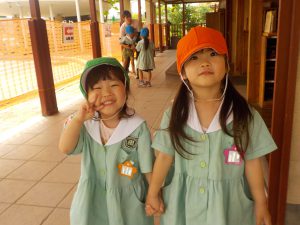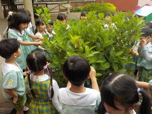 葉っぱを描く前に幼稚園に植えてあるあじさいを実際に見に行きました!