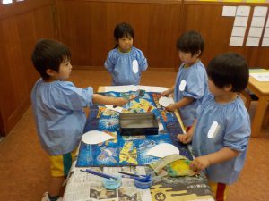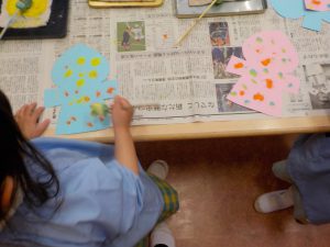 今日は、6月の壁面製作をしました。雨粒を青色と水色の2色でにじみ絵で上手に色付けをしました。