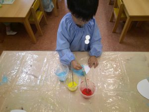 絵の具あそびでは、ビー玉に絵の具をつけて転がす技法を行いました😊
