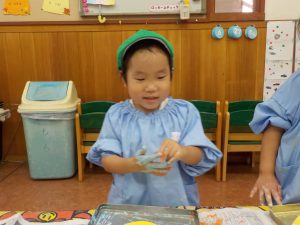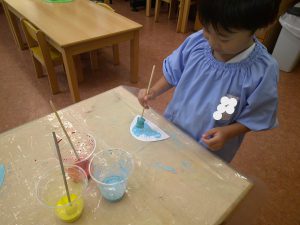 「僕は水色にする!」「私はれもん組だから黄色にする!」と、絵の具スタンプだけでなく色選びから楽しんでいました!