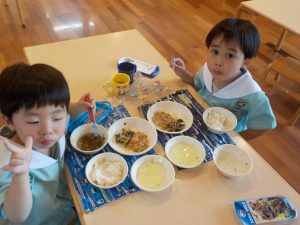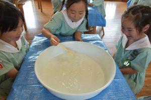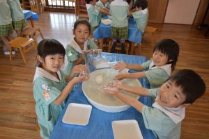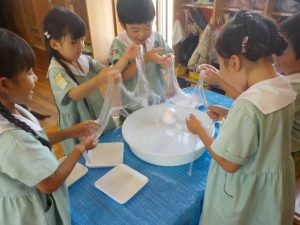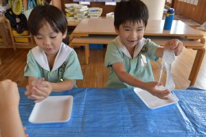 19日にすみれ組、たんぽぽ組、26日にひまわり組、さくら組がかがくタイムでスライム作りを行いました!