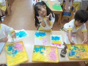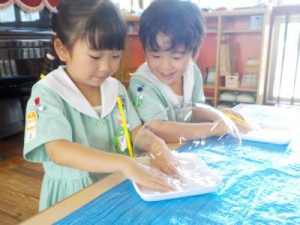 完成したスライムを使って、手形を押したり、ハートの形を作ったり、丸めて上から落としてみたり、思い思いに楽しんでいました♪
