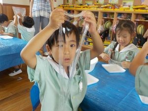 洗濯のりと魔法の水(ホウ砂飽和水溶液)を混ぜるとサラサラだった水が段々とスライムになっていく過程に、「すごーい!」「スライムになってきた~」と嬉しそうな子どもたち😊