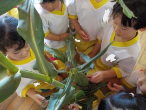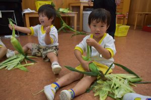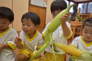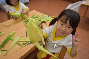 トウモロコシの観察も「皮がふさふさ!!」「すごーい!ひげみたい!」とたくさんの発見をしていました👀