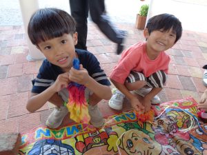 広げてみるとハートや星、丸やぐるぐるの模様が👀「かわいいのが出来た!」「みて!!色が混ざったよ!」とお友だちと嬉しそうに見せ合う姿が素敵でした💕