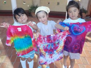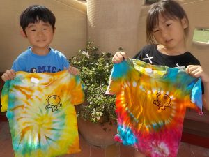 てんちゃんTシャツのタイダイ染めでは、クラスカラーに好きな色を組み合わせてオリジナルTシャツの完成👕