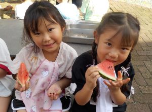 スイカ割りでは、目隠しをしてスイカまでよーいドン!!「みぎ!みぎ!」「がんばれ!!」など応援の声がしっかり届いて見事スイカを割ることが出来ました🍉