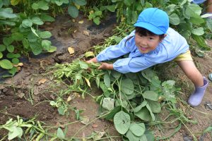 枝豆の畑に行くと、「どこにあるの~??」と初めは枝豆が見えず、キョロキョロしていた子ども達でしたが、しゃがむとたくさんの枝豆が見え、「いっぱいある👀」と嬉しそうな子どもたち⭐
