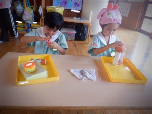 シェーンでは発音の仕方を真似したり、カードを見て何のイラストが描いてあるかを当てたりと自分自身で考えながら発言したり発表することが出来ました💡