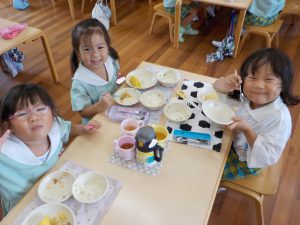 そして今日はもも組さん、いちご組さん、つくし組さんの3クラスでランチルームで食べました🍴🍚