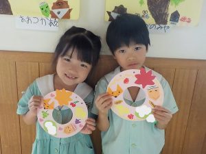 きつね、どんぐりを折り紙で折ったり、紅葉やイチョウの葉を切ったりと様々な工程を楽しんで行っていました!