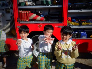その後は先生たちの消火訓練を見学し、消防車と一緒に写真を撮りました📸