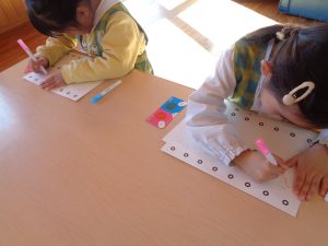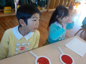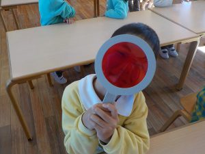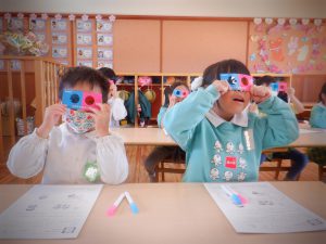 月曜日にひまわり・さくらぐみ、本日すみれ・たんぽぽぐみがかがくタイム(色・立体視)を行いました。