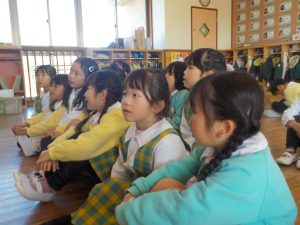 今日は久しぶりの朝礼で理事長先生から様々なお話がありました。園庭の様子、季節のお話、干支のお話もしてくれました。明日のお餅つきのお話もあり、きねとうすを使うこと、もち米から出来ることなどたくさん教えてくれました。