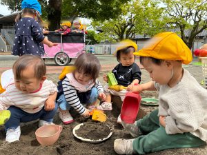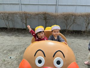 今日のめばえ組さん! 2026/04/24 今日は緑の詩保育園の園庭に遊びに行きました。めばえ組さんはお砂場とアンパンマン号がお気に入りで、お砂場ではスコップを持ってお皿に砂を入れる子や砂を触って感触を楽しんでいる子など、それそれがお砂場を楽しんでいました! また、アンパンマンが大好きな子が多くアンパンマン号を見るとニコニコになり、ハンドルを回して「レッツゴー!!」と言いながら運転していました☆ 沢山遊んでそれぞれのお気に入りの場所やおもちゃを見つけていこうと思います! めばえ組担任 佐藤